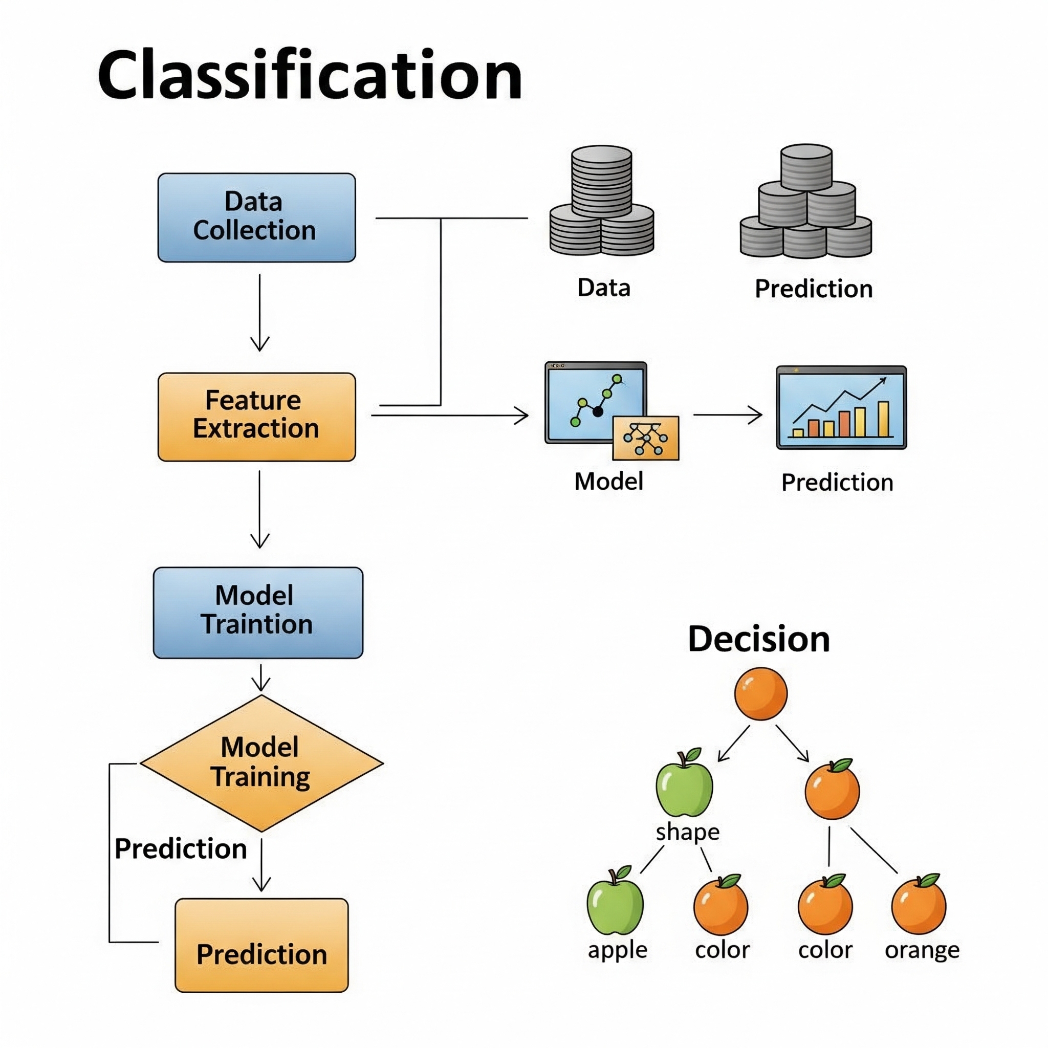 이 두 가지는 겉보기에 둘 다 예측처럼 보이지만, 속성상 전혀 다릅니다. 왜냐하면 하나는 “종류를 맞추는” 문제이고, 다른 하나는 “숫자를 예측하는” 문제이기 때문입니다. 이 차이에서 AI는 분류와 회귀라는 두 갈래로 나뉘게 됩니다.