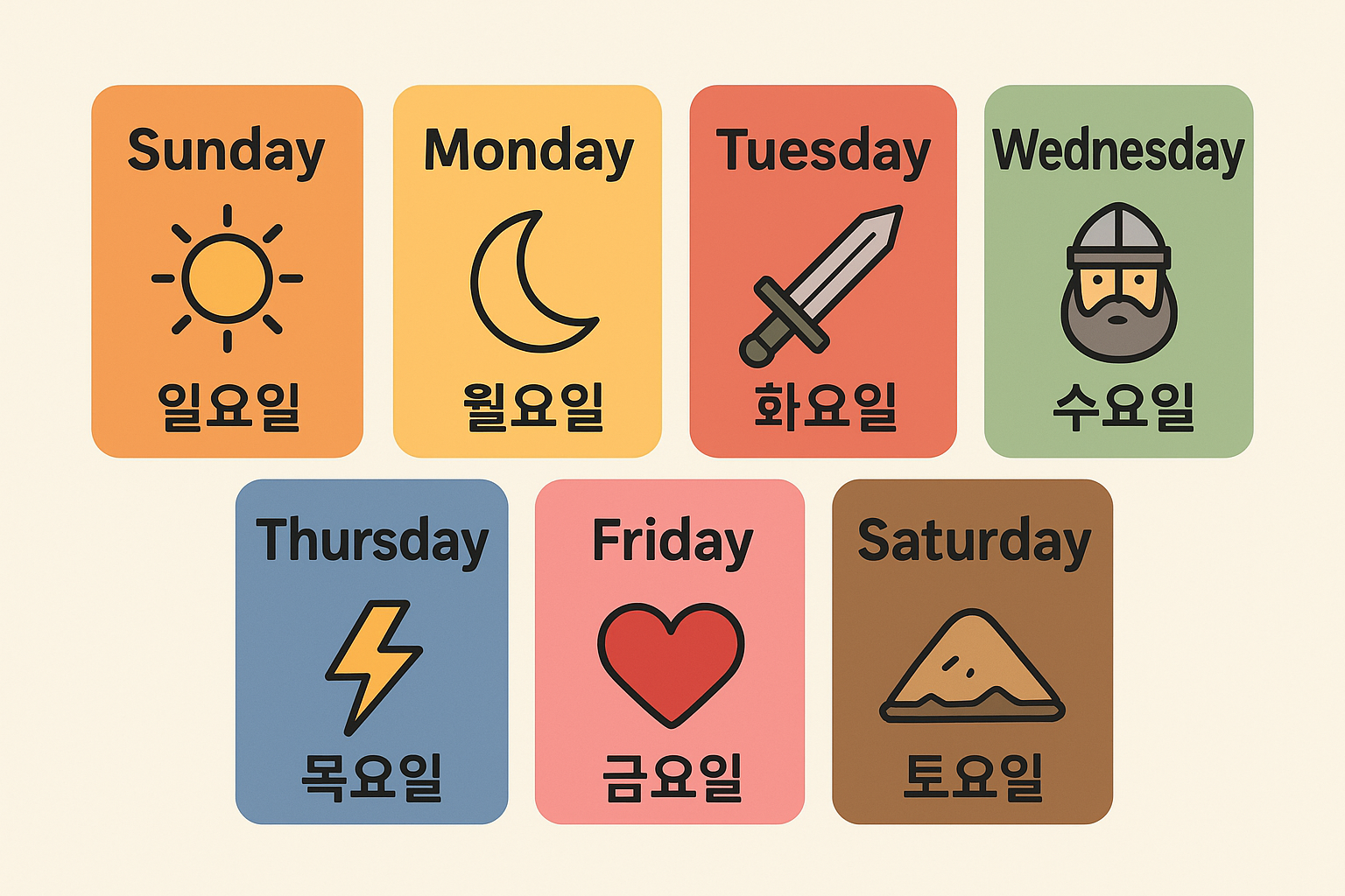 👉 한국어 요일은 기본적으로 천체와 오행에서 비롯된, 보다 철학적이고 음양오행적인 의미를 갖고 있다고 할 수 있습니다.