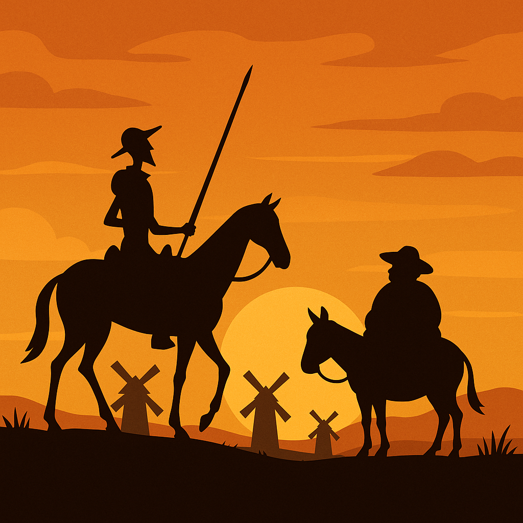 하지만 이미 ‘기사 모드’에 들어간 돈키호테는 풍차를 향해 돌진했다가, 날개에 맞고 말에서 떨어져 나뒹굴어 버립니다. 이 장면은 이후 “풍차와 싸운다” → 존재하지 않는 적과 싸운다 / 쓸데없는 싸움을 한다 라는 문화적 은유로 자리 잡았습니다.