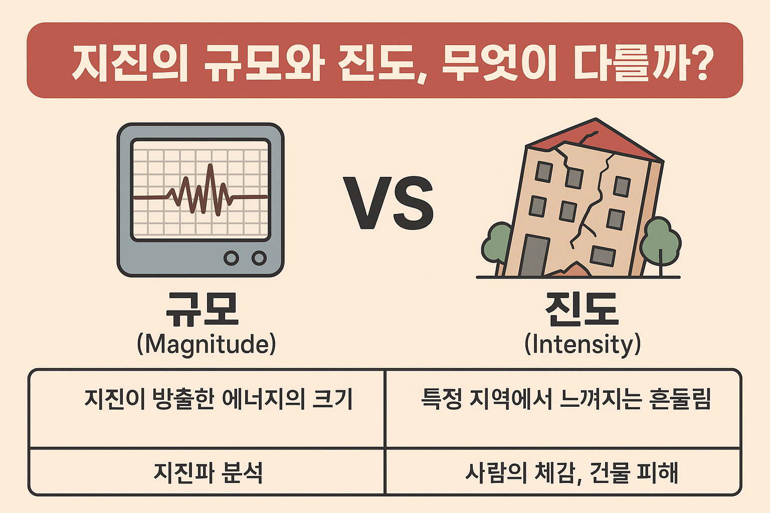 | 의미 | 지진이 방출한 에너지의 크기 | 특정 지역에서 느껴지는 흔들림 |