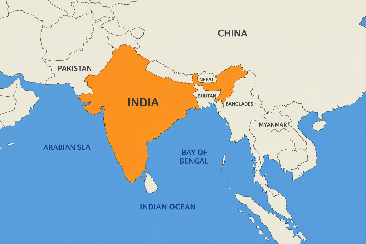 인도는 남아시아의 대부분을 차지하는 나라입니다. 서쪽으로는 아라비아해, 동쪽으로는 벵골만, 남쪽으로는 인도양과 접하고 있으며, 북서쪽으로 파키스탄, 북쪽으로 네팔·중국·부탄, 동쪽으로 미얀마와 맞닿아 있습니다. 동쪽의 방글라데시는 인도에 크게 둘러싸인 형태를 띱니다. 이런 지리적 위치 때문에 인도는 육상과 해상 양쪽에서 모두 전략적 중요성이 매우 큰 국가입니다. 지도를 보면 인도는 아시아 본체에서 아래로 길게 돌출된 거대한 반도입니다. 이 형태 덕분에 인도는 오래전부터 해상무역과 문명 교류의 중심지 역할을 해 왔습니다. 서쪽으로는 중동과 아프리카, 동쪽으로는 동남아시아, 북쪽으로는 중앙아시아 및 중국권과 연결되며, 바다를 통해서는 인도양 항로를 장악하는 데 유리한 위치를 가집니다. 그래서 오늘날에도 인도는 지정학적으로 매우 중요한 나라로 평가됩니다. 또한 북쪽에는 히말라야라는 거대한 산악 장벽이 있어 외부와 완전히 같은 방식으로 연결되기보다는, 독자적인 문명권으로 발전하는 데 유리했습니다. 브리태니커도 인도와 방글라데시, 파키스탄 대부분이 함께 하나의 뚜렷한 아대륙(subcontinent) 을 이룬다고 설명합니다. 즉 인도는 그냥 큰 나라가 아니라, 사실상 하나의 문명권 중심부라고 이해하면 쉽습니다.