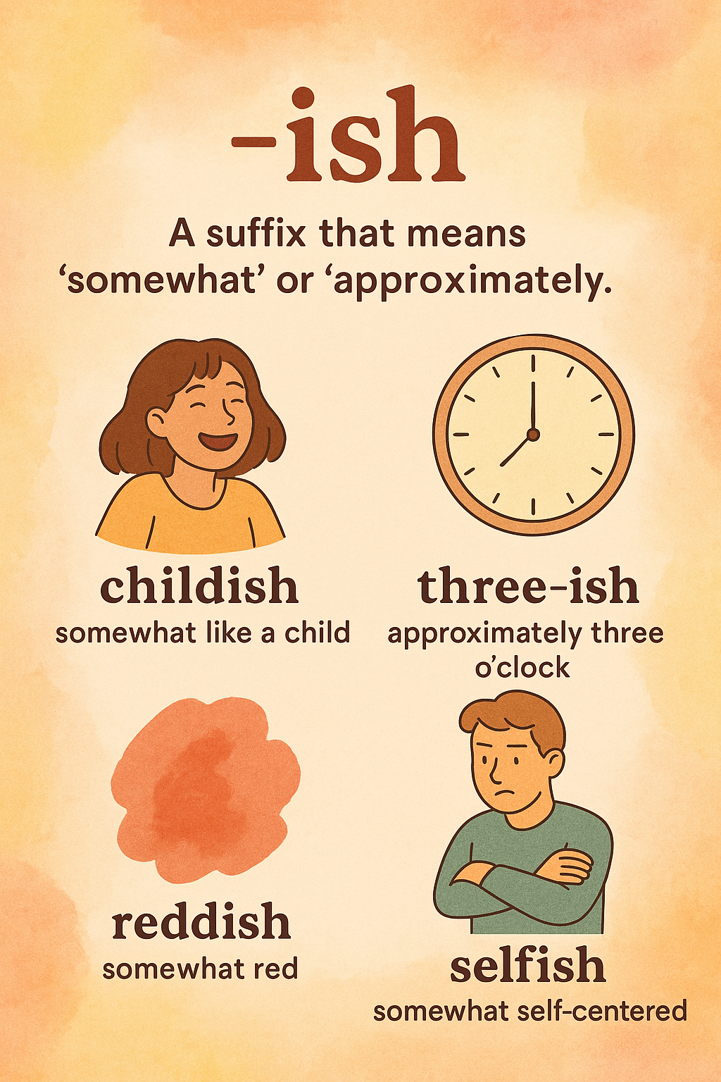 영어에는 단어 뒤에 붙어서 그 뜻을 미묘하게 바꾸거나, 말의 뉘앙스를 풍부하게 만들어주는 접미사(suffix) 들이 많이 있습니다. 그 중에서도 ‘~ish’ 는 일상 대화 속에서 자주 등장하는 접미사이자, 영어를 더 자연스럽고 풍부하게 만들어주는 마법 같은 요소입니다. 혹시 “5시-ish?”라고 묻는 영어 문장을 들어본 적 있나요? 이 짧은 “-ish” 하나가 정확한 표현을 피하면서도 분위기를 살리고, 대화를 부드럽게 만들어줍니다. 오늘은 ‘-ish’가 어떤 뜻을 갖고 있는지, 어디서 유래되었는지, 그리고 어떻게 쓰이는지 살펴보며 영어에 감칠맛을 더해보도록 하겠습니다. 😄
