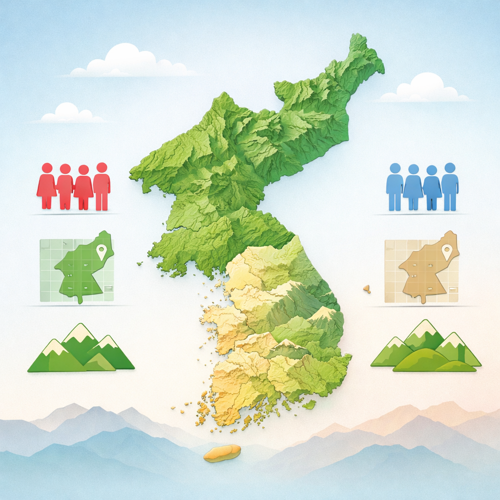 👉 한반도 전체 면적의 약 55%를 차지합니다. 흥미로운 점은 북한이 남한보다 국토는 더 넓지만, 인구는 절반 수준이라는 점입니다.