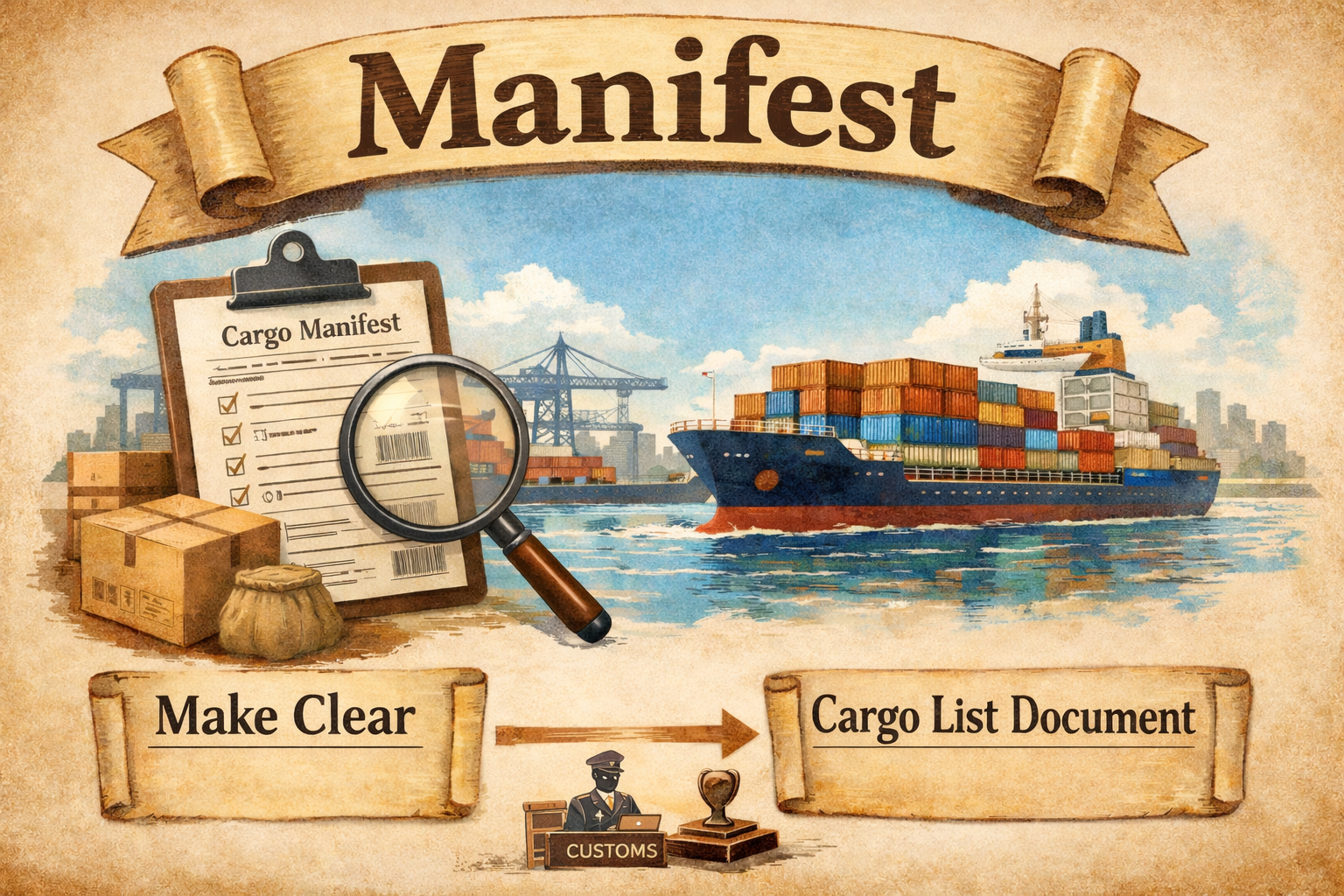 manifest의 뿌리 뜻은 대략 “명백한 / 명확히 드러난”이에요. 항만·세관 문맥에서 중요한 건 “이 배에 뭐가 실렸는지”를 숨길 수 없게 문서로 명확히 드러내는 것이죠.그래서 “화물을 manifest(명시/공개)한다” = 화물을 서류로 분명히 신고한다가 됩니다.