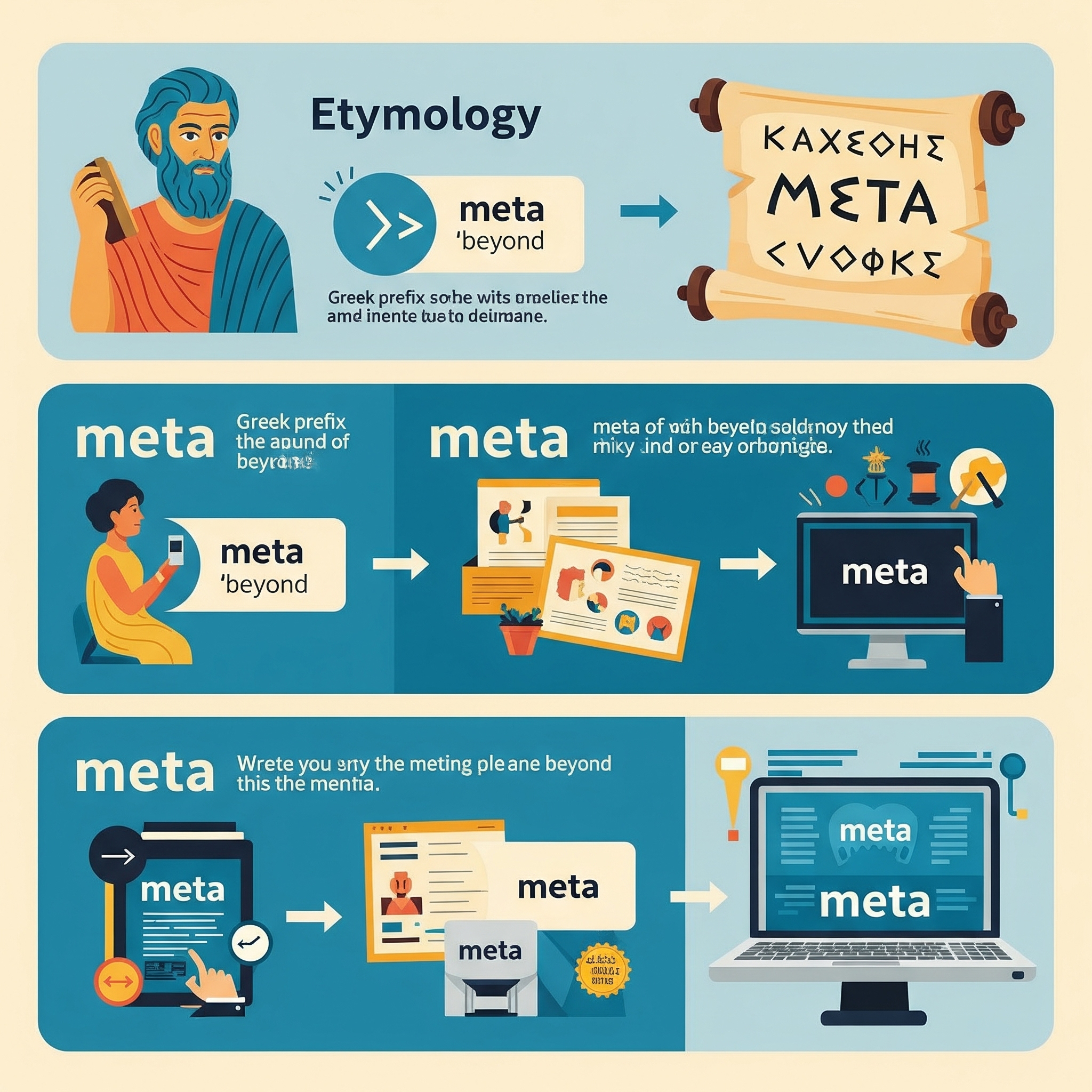 meta(메타) 는 고대 그리스어 접두사로, 원래 뜻은 “~을 넘어서”, “~의 바깥에”를 의미합니다. 예를 들어, 철학 용어인 metaphysics(형이상학) 은 “물리학을 넘어서”라는 의미에서 유래되었으며, 물리적 세계를 초월한 개념들을 다루는 학문입니다. 이 ‘넘어서다’는 개념은 매우 중요한데요, 바로 이 추상적 의미 덕분에 ‘meta’는 다양한 분야에 적용됩니다.