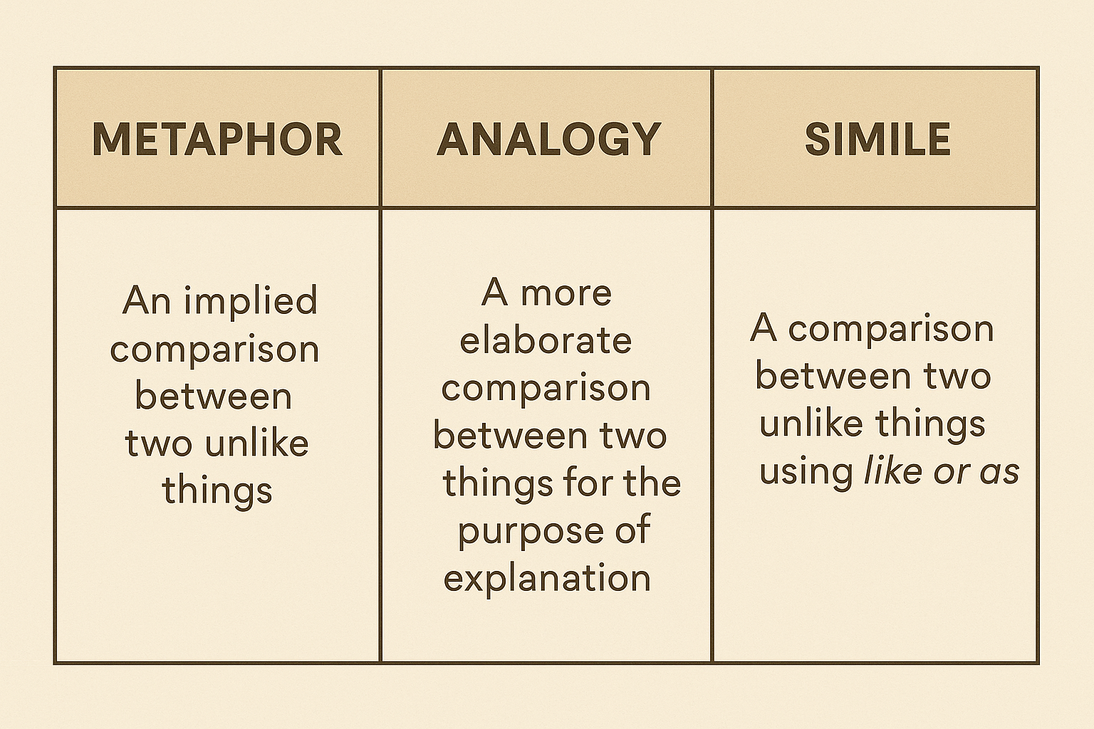 | simile (직유) | 비교를 명시 | like / as | 친절·안전 | 일상 대화, 설명 글, 작문 |