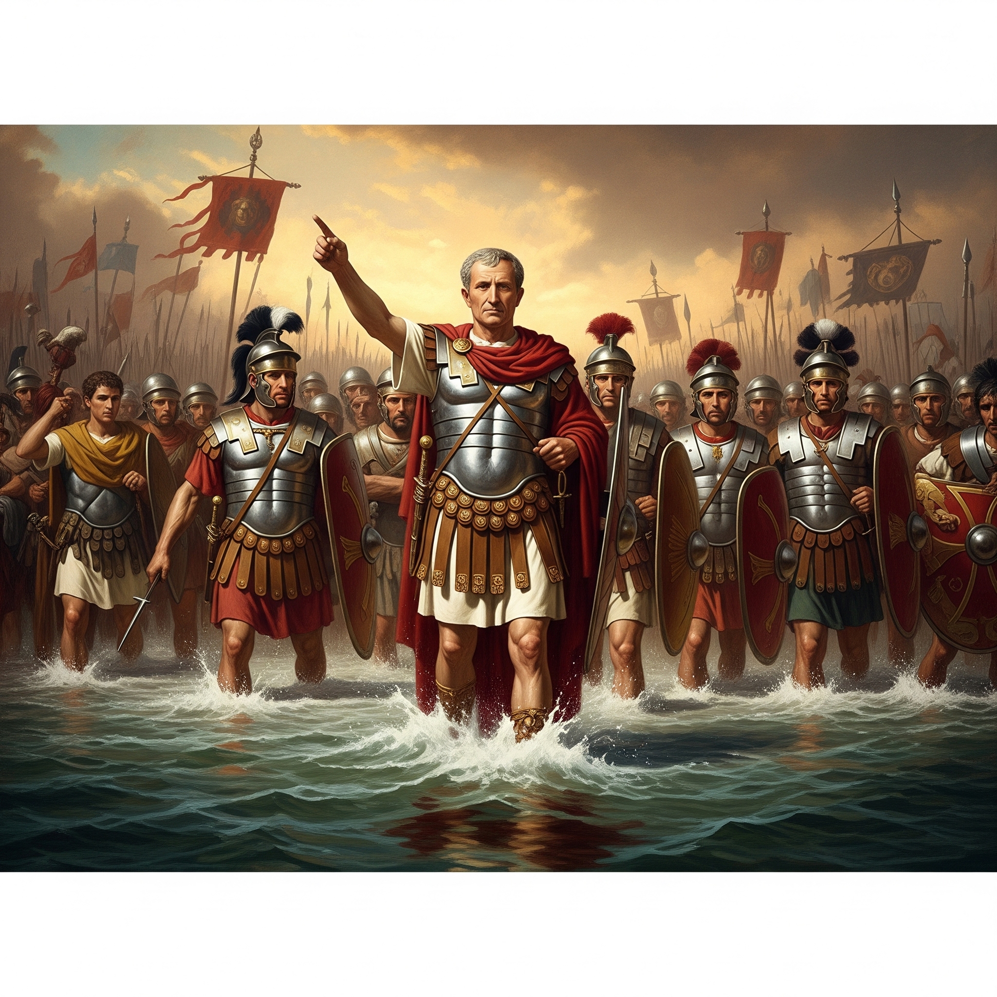 기원전 49년, 로마의 장군 율리우스 카이사르(Julius Caesar)는 갈리아 전쟁에서 큰 승리를 거둔 뒤, 정치적으로 강해졌습니다. 하지만 로마 원로원은 그가 권력을 장악할 것을 두려워하며 무장 해제와 귀환 명령을 내렸습니다.