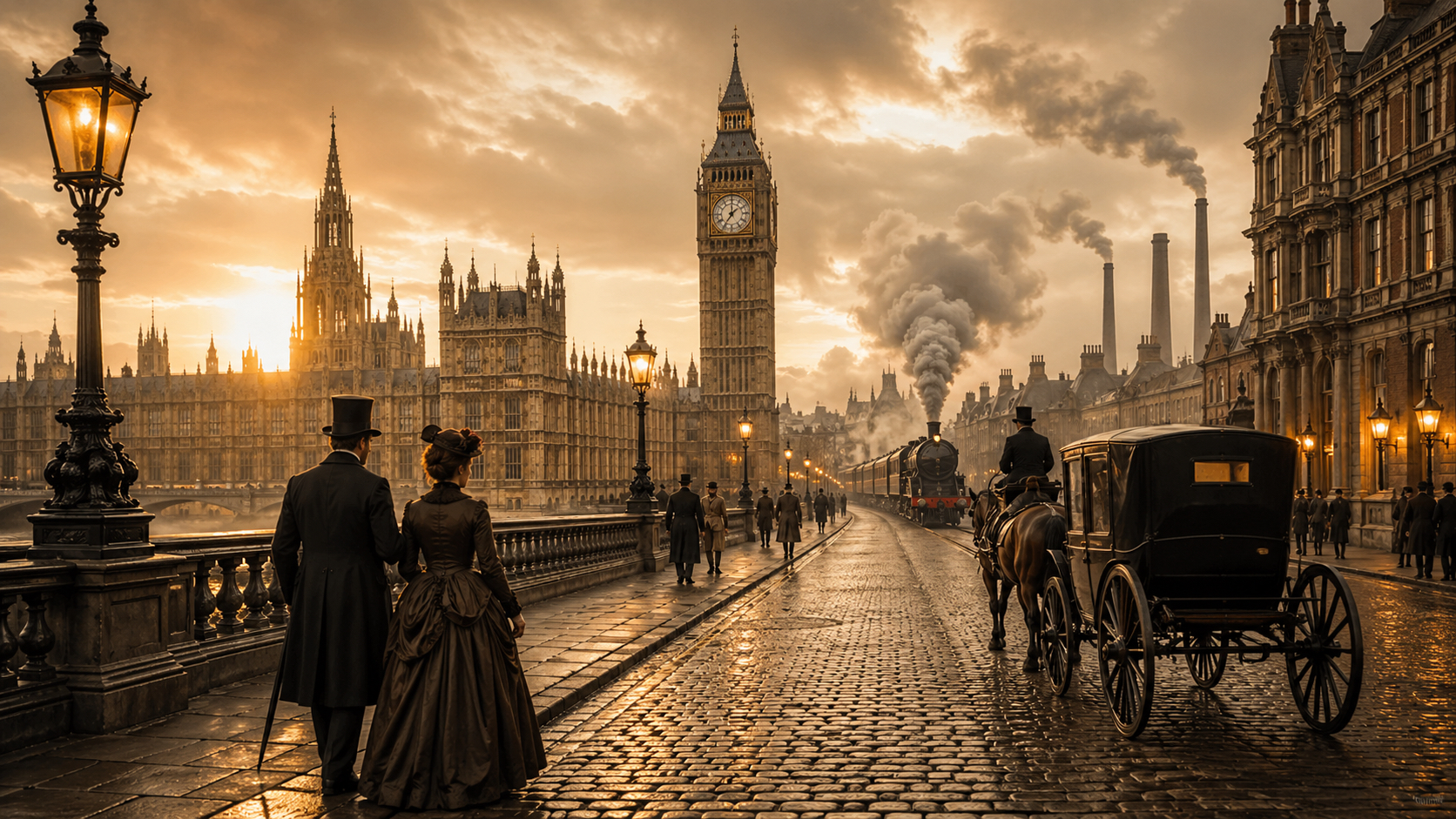 빅토리아 시대를 이해할 때 가장 중요한 배경 중 하나는 산업혁명입니다. 증기기관, 철도, 공장, 석탄 산업 등이 발전하면서 영국 사회는 빠르게 바뀌었습니다. 사람들은 농촌에서 도시로 이동했고, 런던과 맨체스터 같은 대도시는 급격히 성장했습니다. 이전의 영국이 농업 중심 사회였다면, 빅토리아 시대의 영국은 점점 공장과 도시 중심의 산업사회로 변해 갔습니다. 철도는 사람과 물건의 이동을 빠르게 만들었고, 공장은 대량생산을 가능하게 했습니다. 그 결과 영국은 막대한 경제적 부를 축적할 수 있었습니다.