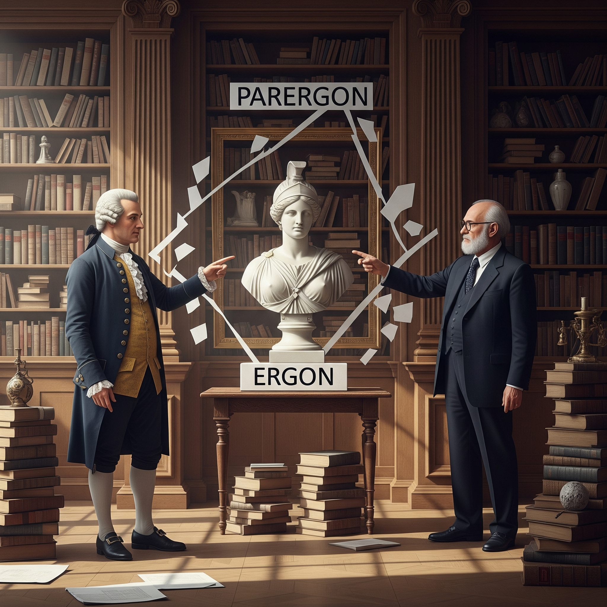칸트는 『판단력 비판』에서 예술작품의 ‘본질’(에르곤)과 ‘장식’(파레르곤)을 구별합니다. 그는 말합니다.