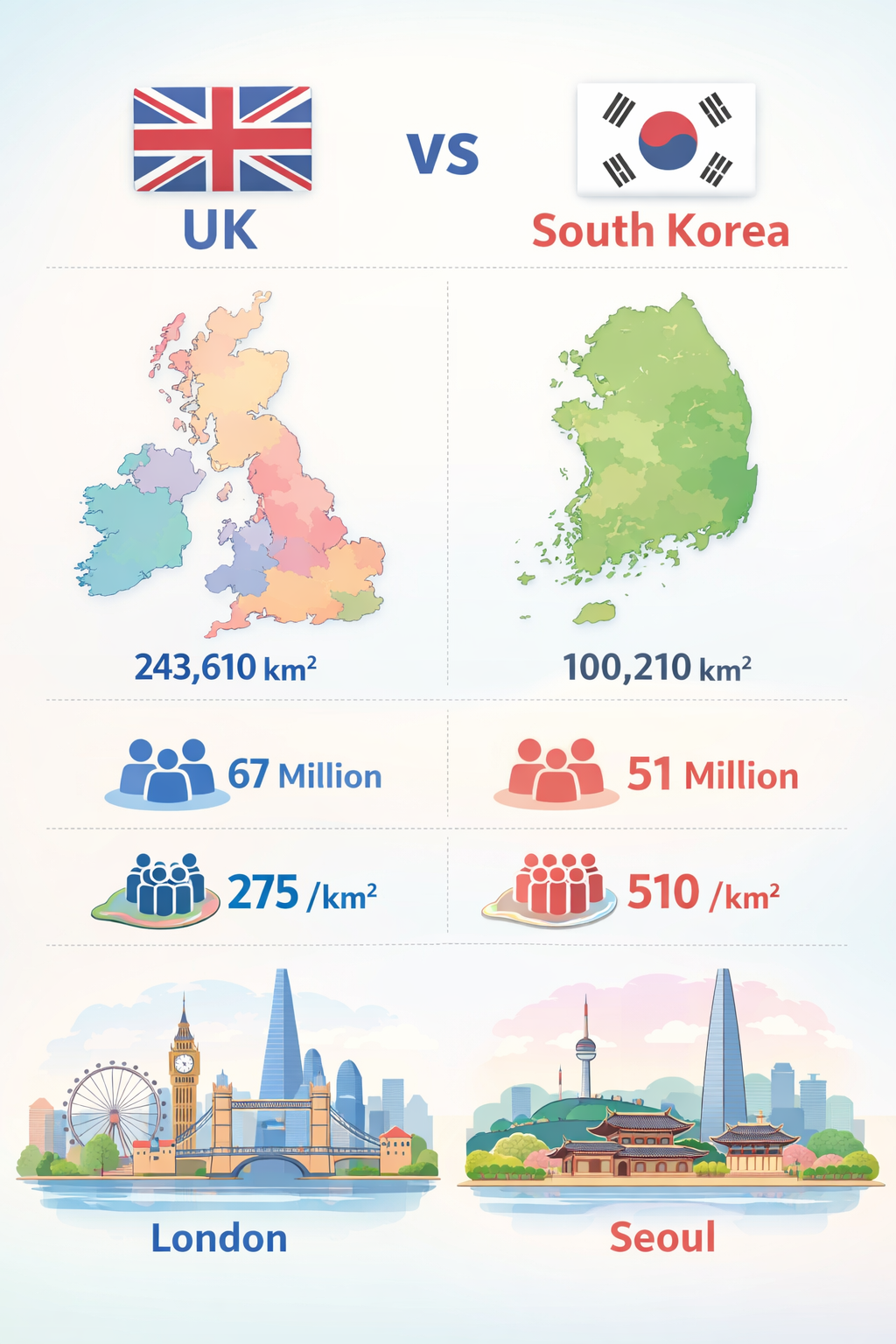 🇬🇧 영국 vs 🇰🇷 대한민국 면적, 인구, 밀도까지 한눈에 비교해보면?